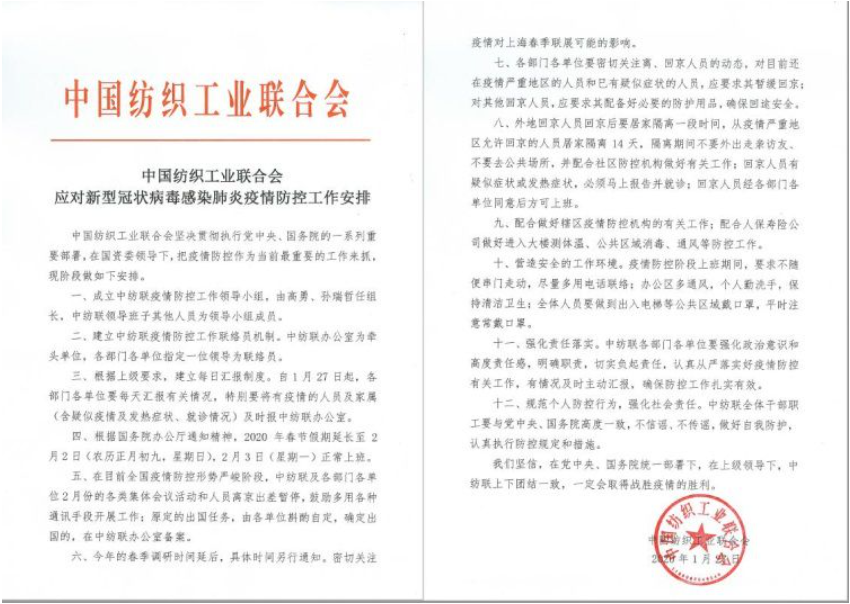 與此同時,響應國務院延長春節假期的部署,紡織人積極行動,轉換防線為戰勝疫情做出貢獻。1月27日,中國紡織工業聯合會堅決貫徹執行黨中央、國務院的一系列重要部署,在國資委領導下,積極行動,把疫情防控作為當前最重要的工作來抓,對現階段工作進行了安排為有效遏制疫情蔓延。