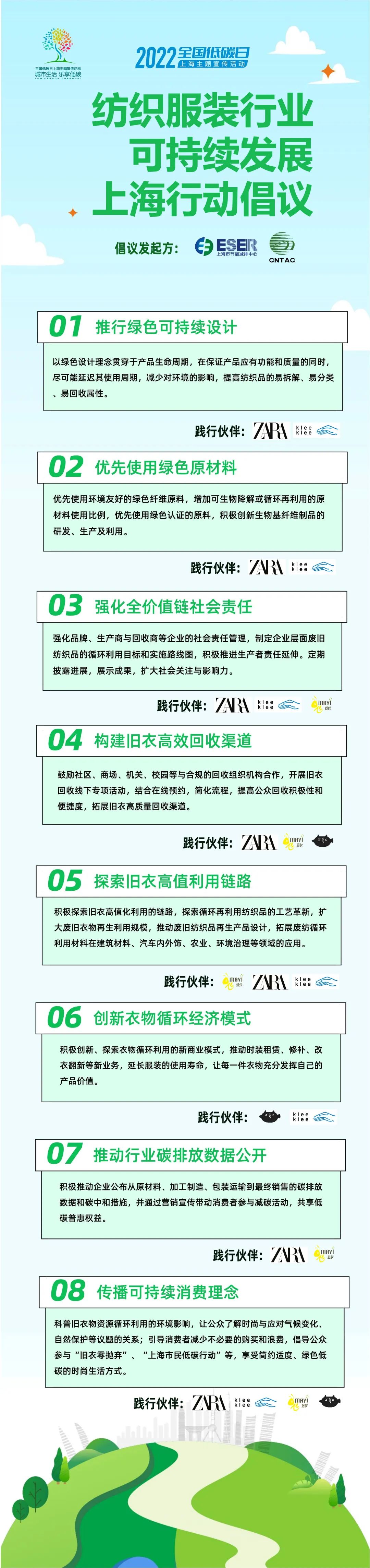 我們也呼吁各方攜手,在紡織服裝產品的全生命周期過程中踐行低碳發展理念,開展環境影響特別是碳減排領域評估,探索區域舊衣循環利用長效機制,提升上海城市資源化利用水平,加快推動無廢城市建設,攜手共建美好家園。