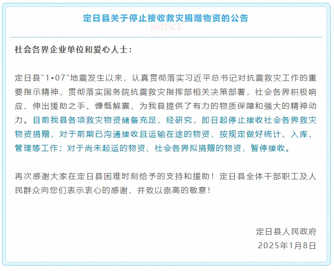 據(jù)不完全統(tǒng)計,截至8日17時,相關(guān)大額捐贈(含物資)超2.3億元,定日縣即日起停止接收社會各界救災(zāi)物資捐贈。