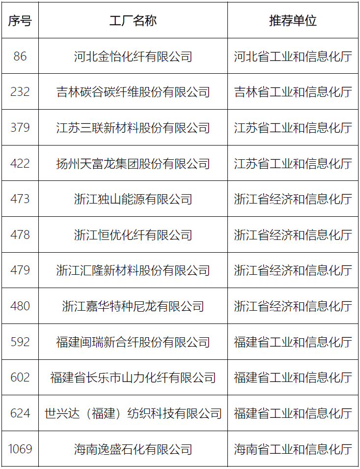 工信部按照《綠色工廠梯度培育及管理暫行辦法》(以下簡(jiǎn)稱《管理辦法》)有關(guān)要求,經(jīng)申報(bào)單位自愿申報(bào)、省級(jí)工業(yè)和信息化主管部門推薦及專家評(píng)審、公示等程序,確定了2024年度綠色制造名單。1月23日,工業(yè)和信息化部網(wǎng)站公布了 2024 年度綠色制造名單。在2024年度新培育出的 1382 家國(guó)家層面綠色工廠、123 家綠色工業(yè)園區(qū)以及 126 家綠色供應(yīng)鏈管理企業(yè)中,有12家化纖相關(guān)企業(yè)入選綠色工廠名單。