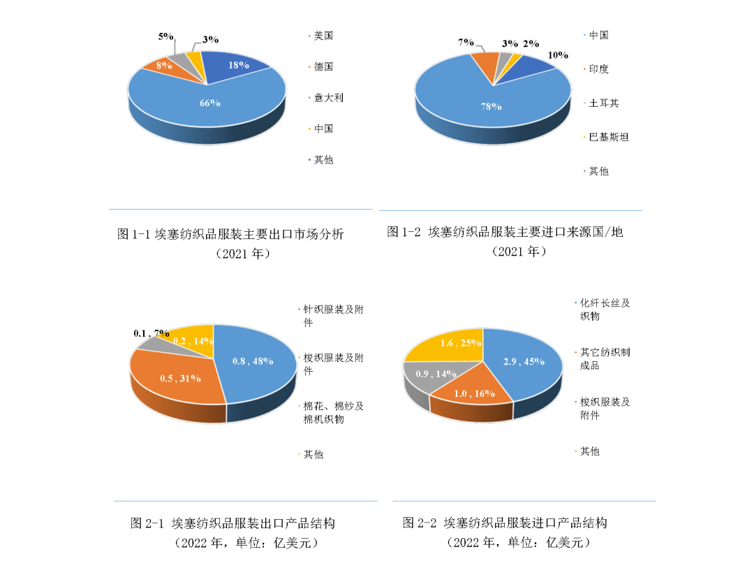 2022年,埃塞自全球進口紡織品服裝金額為6.5億美元,其中化纖長絲及織物(2.9億美元,占比44.5%)、梭織服裝及附件(占比14.4%)等是主要進口大類產品。中國是埃塞最大的紡織品服裝進口來源國,2021年埃塞自中國進口纖維原料、紡織品服裝金額共4.4億美元,占比達到78%;此外印度(占比6.9%)、土耳其(占比3.1%)、巴基斯坦(占比2.2%)也是埃塞主要紡織品服裝進口來源國。