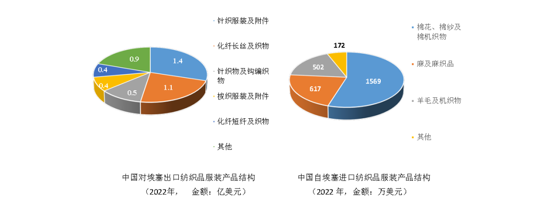 隨著投資合作深入,中埃紡織品服裝貿易往來也日益密切,近年來貿易規模在新冠肺炎疫情沖擊下仍基本保持穩定。根據中國海關數據,2022年中國與埃塞俄比亞紡織品服裝進出口總額達5.1億美元,其中,中國對埃塞出口4.8億美元,主要出口產品包括服裝及衣著附件(1.8億美元,占比37.5%)、化纖長絲及織物(1.1億美元,占比22.9%)、針織物及鉤編織物(占比10.4%)等。中國自埃塞進口紡織品服裝規模較小,僅為中國對埃塞出口紡織品服裝規模的6%左右,但近年來保持較快增勢,2022年中國自埃塞進口紡織品服裝金額約為2860萬美元,其中天然纖維及制品進口規模是絕對主體,棉花、麻、羊毛紗及織物等天然纖維原料及制品合計占進口總額的比重達90%以上。