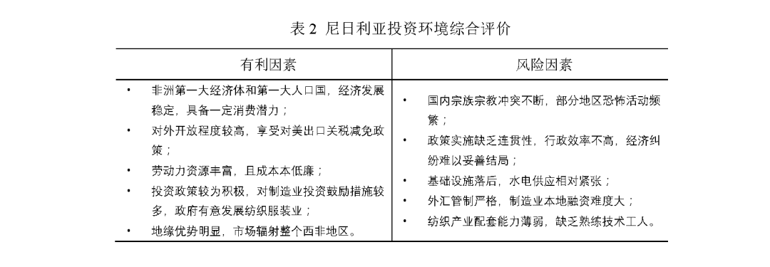 (2)對(duì)外開放程度整體較高,政府發(fā)展棉紡、化纖等紡織產(chǎn)業(yè)鏈上游環(huán)節(jié)的意愿較強(qiáng),對(duì)紡織產(chǎn)業(yè)外國(guó)投資持歡迎態(tài)度,且擁有數(shù)量充足且成本相對(duì)低廉的勞動(dòng)力,對(duì)美國(guó)出口紡織品服裝享受關(guān)稅減免政策,為在當(dāng)?shù)匕l(fā)展出口加工型企業(yè)提供了較好環(huán)境。考慮要素條件及政策環(huán)境,尼日利亞在發(fā)展棉紡織、服裝加工等領(lǐng)域具有一定投資條件。