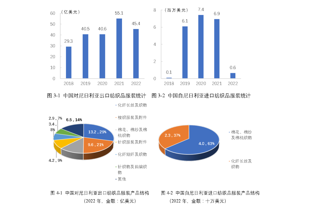 中國(guó)與尼日利亞于1971年建交,2005年兩國(guó)元首就雙方建立戰(zhàn)略伙伴關(guān)系達(dá)成共識(shí),2018年兩國(guó)央行簽署了雙邊本幣互換協(xié)議,2021年兩國(guó)建立中尼政府間委員會(huì)機(jī)制。尼日利亞是中國(guó)在非洲的第一大工程承包市場(chǎng)、第二大出口市場(chǎng)、第三大貿(mào)易伙伴和主要投資目的地國(guó)。2022年,中尼雙邊貿(mào)易額為239億美元,其中紡織服裝產(chǎn)品是我國(guó)對(duì)尼出口的主要商品之一。