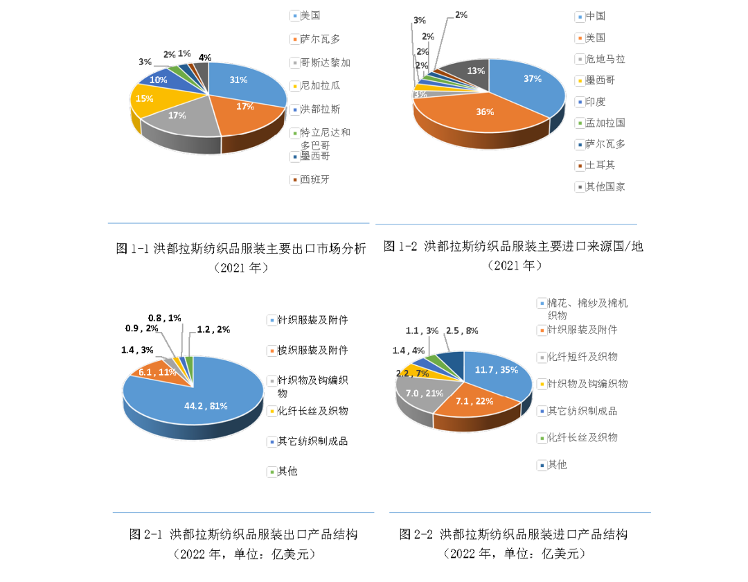 洪都拉斯是拉丁美洲主要紡織品服裝出口國之一,洪都拉斯國家統計局(Instituto Nacional de Estadísticas (INE) de Honduras statistics )數據顯示,2022年洪都拉斯紡織品服裝出口總額54.6億美元,占全國出口總額的近90%;其中,紡織品出口4.3億美元,服裝出口50.3億美元,服裝出口額中88%為加工工藝相對簡單的針織服裝。同年,洪都拉斯紡織品服裝進口額為33.2億美元,主要進口產品為棉紗及棉機織物(占比35%)、針織服裝及附件(占比22%)、化纖短纖及織物(占比21%)等。洪都拉斯的紡織品服裝主要出口至美國、薩爾瓦多、哥斯達黎加、尼加拉瓜等國家,主要進口來源國則是中國和美國,占紡織品服裝進口總額的比重超過70%。