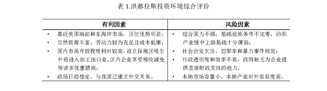 洪都拉斯紡織產業與美國采購供應鏈合作緊密,對應我國紡織企業部分海外投資需求,但考慮到其基礎設施落后、電力供應不足、能源成本較高、工業基礎薄弱、勞動力素質較低以及與我國國內紡織產業鏈距離較遠等客觀條件,建議紡織企業深入考察,謹慎、全面做好投資評估和預案。