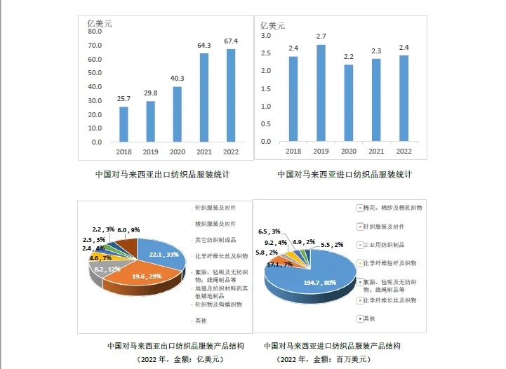 馬來西亞是第一個與中國建交的東盟國家,也是中國在“一帶一路”沿線的第四大紡織品服裝貿易伙伴。據中國海關統計,2022年中國與馬來西亞紡織品服裝進出口總額為69.8億美元,其中出口額67.4億美元,進口額2.4億美元。中國紡織行業對馬來西亞主要出口產品包括針織服裝及衣著附件(占比32.7%)、梭織服裝及衣著附件(占比29.1%)等;主要進口產品為棉花、棉紗及棉機織物,占比高達79.9%。
