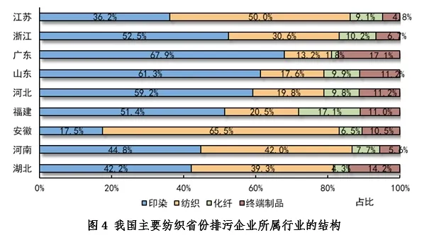 根據(jù)本文分類二,排污企業(yè)所屬行業(yè)分類簡化為紡織、印染、終端制品和化纖4個。從主要省份排污企業(yè)行業(yè)結(jié)構(gòu)看,各地存在差異。江蘇省紡織(化纖噴水織造為主)企業(yè)和印染企業(yè)數(shù)量分別為2,442家和1,769家,占比分別為50.0%和36.2%;浙江省印染企業(yè)和紡織企業(yè)分別為1,227家和716家,占比分別為52.5%和30.6%;廣東省印染企業(yè)和終端制品企業(yè)數(shù)量分別為951家和240家,占比分別為67.9%和13.2%。此外,山東省、河北省和福建省以印染為主,安徽省以紡織為主,湖北省、河南省印染、紡織排污企業(yè)數(shù)量旗鼓相當(dāng),見圖4。