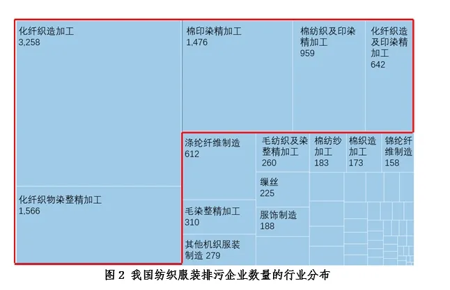 根據(jù)紡織服裝企業(yè)排污許可證行業(yè)分類的數(shù)量分布中,化纖織造加工、化纖織物染整精加工、棉印染精加工、棉紡織及印染精加工、化纖織造及印染精加工企業(yè)數(shù)量共計7,901家,合計占比52.3%,見圖2。
