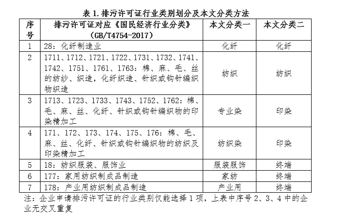 全國紡織服裝行業(yè)排污單位12,039家,其中紡織業(yè)10,284家,化纖制造業(yè)1,047家,紡織服裝、服飾業(yè)708家。在國民經(jīng)濟(jì)行業(yè)分類基礎(chǔ)上,本文按照產(chǎn)業(yè)鏈環(huán)節(jié)對排污許可證所屬行業(yè)進(jìn)行了重新分類,紡織:涉及棉、毛、麻、絲的初加工、紡紗、織造,化纖噴水織造的企業(yè);專業(yè)染:專業(yè)從事印染單一產(chǎn)業(yè)環(huán)節(jié)的企業(yè);紡織染:從事印染并且涉及紡紗、織造的企業(yè);服裝服飾:服裝生產(chǎn)中涉及印染、洗水的企業(yè);家紡:家紡產(chǎn)品生產(chǎn)中涉及印染的企業(yè),與《國民經(jīng)濟(jì)行業(yè)分類》(GB/T4754-2017)對應(yīng)關(guān)系見表1。