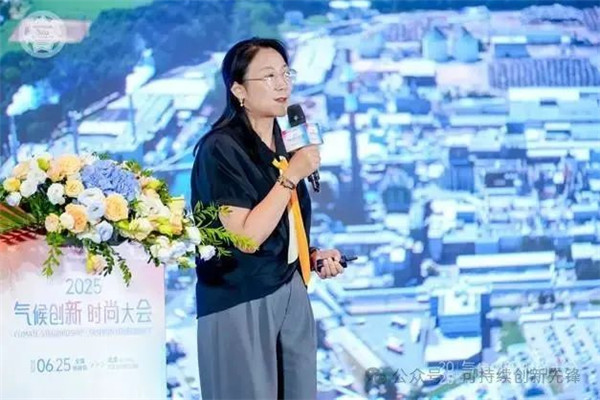 李寧公司環境與可持續發展總監劉維以《李寧公司全鏈路推進氣候轉型》為題,介紹了李寧從產品設計到供應鏈的可持續實踐。其‘源于自然、自然而染、自然新生、回歸自然’的全鏈路體系,廣泛涵蓋了生物基材料的應用、實現了無水染色技術(每件節省40升水)、推出了再生紗線產品(已回收1.9億個塑料瓶)以及降解鞋的研發(土壤中降解率高達80%)。運營方面,李寧北京總部通過光伏覆蓋實現了四分之一的用電量自給自足,并成功獲得碳中和認證;上海低碳門店則每年減少碳排放3.5噸。此外,到2024年,李寧已收集了90%供應商的碳排放數據,并成功推動十家供應商設定了20%的減排目標。