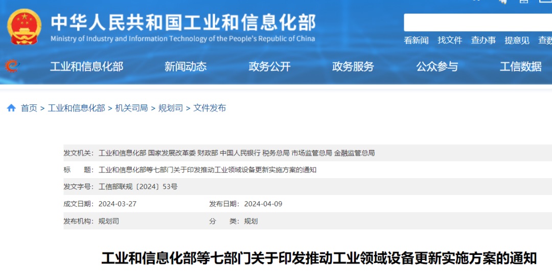 4月9日,工信部等七部門聯合印發《推動工業領域設備更新實施方案》,提出圍繞推進新型工業化,以大規模設備更新為抓手,實施制造業技術改造升級工程,以數字化轉型和綠色化升級為重點,推動制造業高端化、智能化、綠色化發展,為發展新質生產力,提高國民經濟循環質量和水平提供有力支撐。