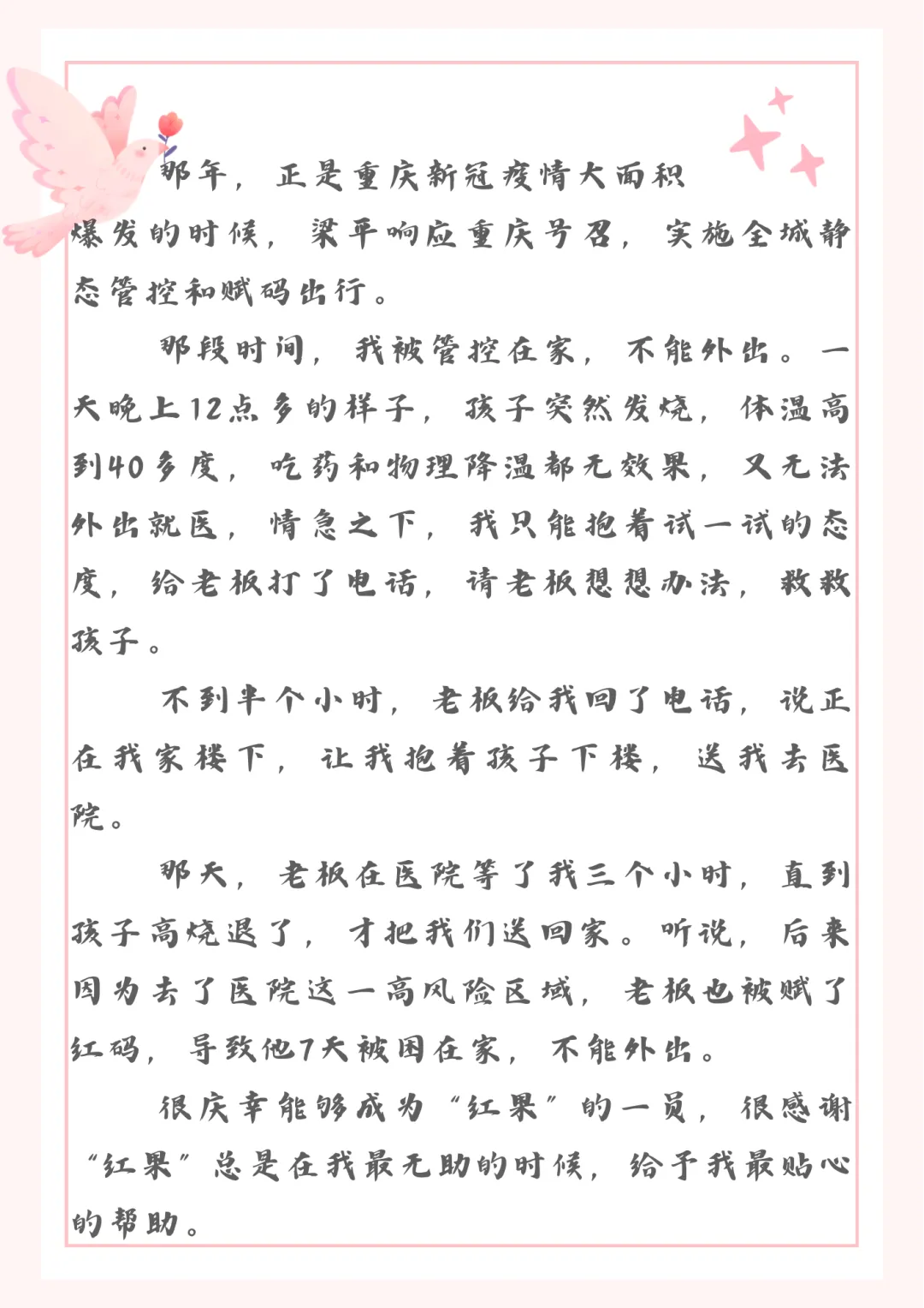 員工徐敏來自四川大竹縣,是2位孩子的母親。進(jìn)入紅果工作后,工廠不但幫助她解決了孩子們的就學(xué)問題,還在疫情最嚴(yán)峻時(shí)期排除萬難,廠長親自護(hù)送她與持續(xù)高燒的孩子到醫(yī)院,讓孩子及時(shí)獲得了治療。